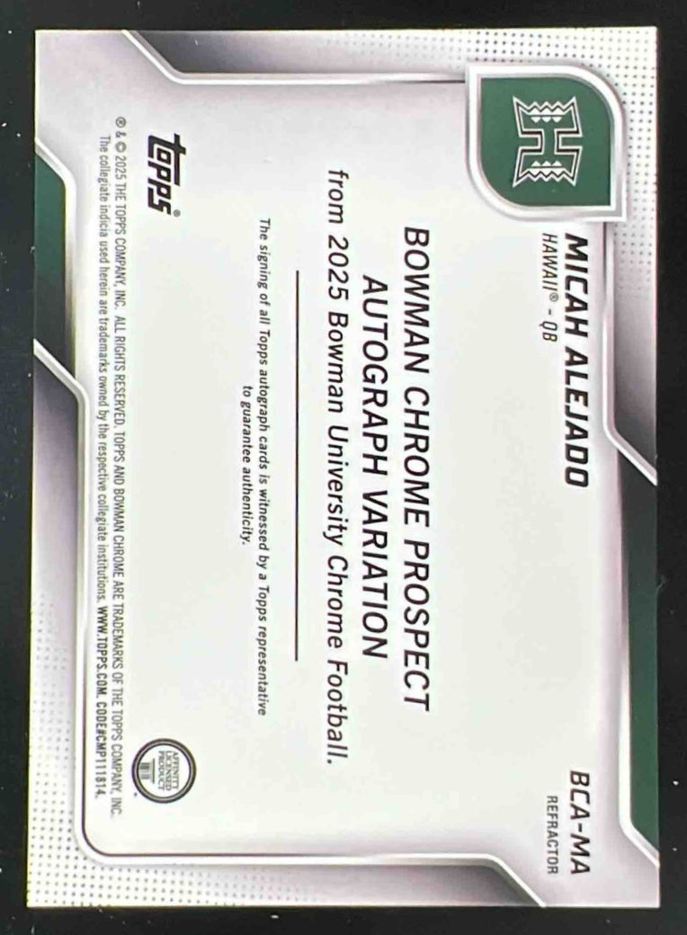 2025 Bowman Chrome University Autograph Refractor #BCAMA Micah Alejado Auto /299
