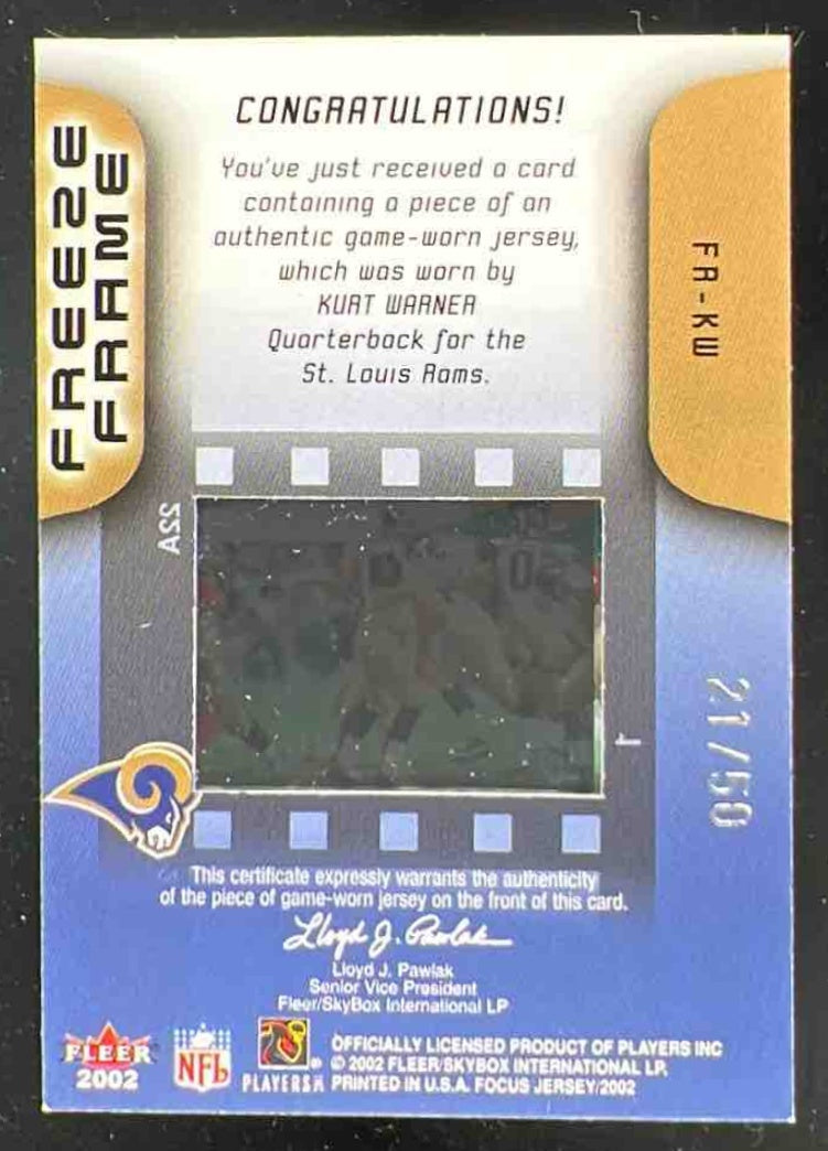 2002 Fleer Focus Jersey Edition Freeze Frame Jersey Patches #KW Kurt Warner /50