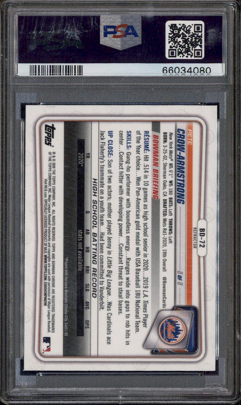2020 Bowman Draft Chrome Refractor #BD72 Pete Crow-Armstrong RC PSA 10