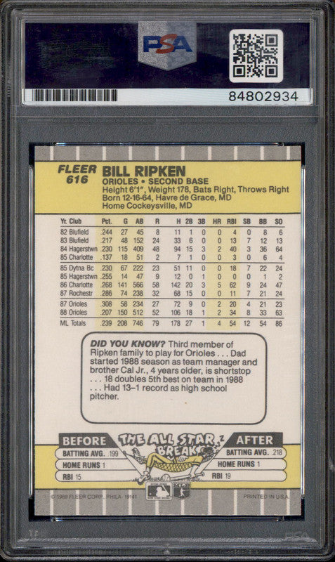 1989 Fleer #616 Billy Ripken Rookie Autograph RC Auto PSA 10