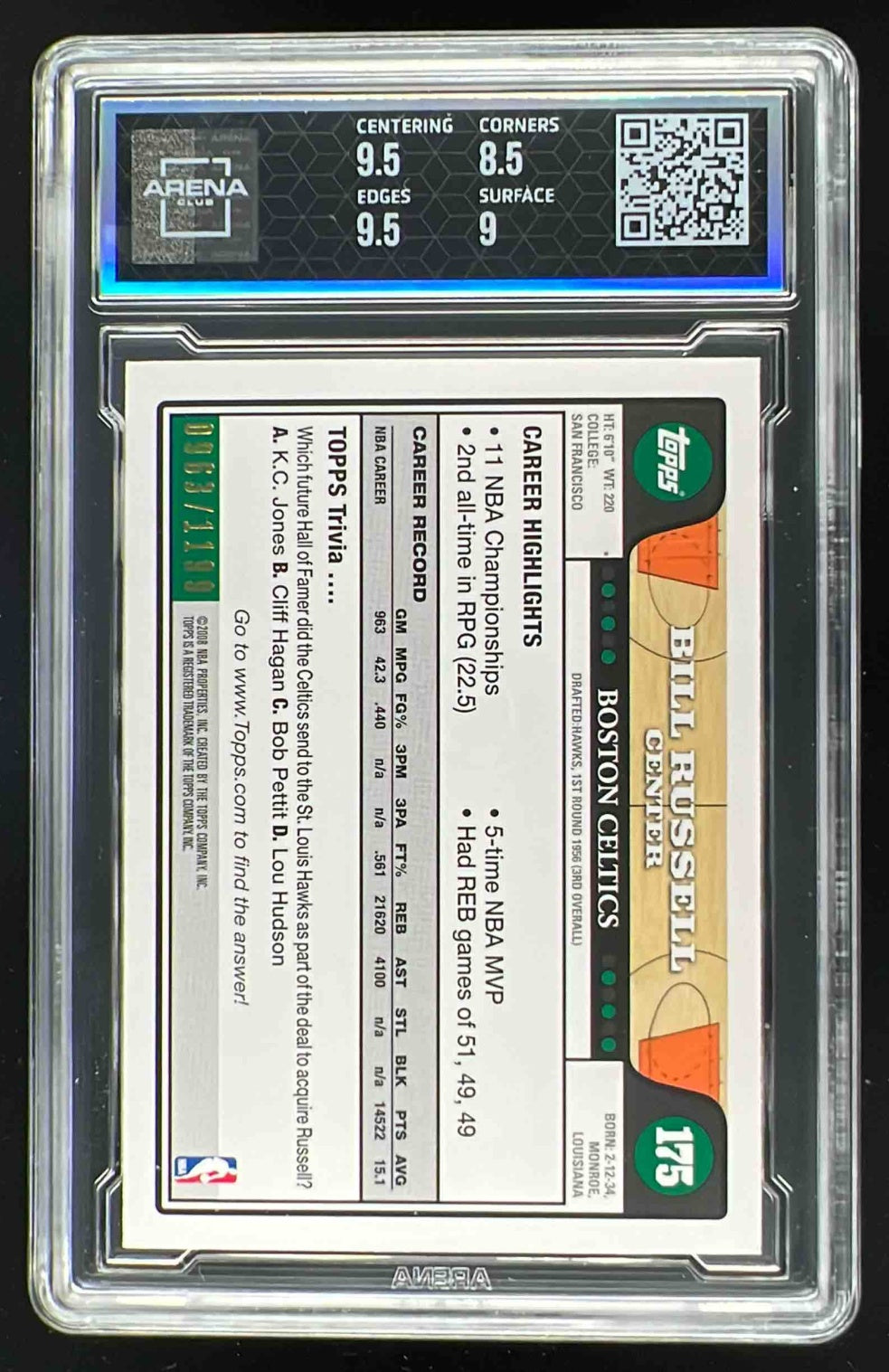 2008-09 Topps Orange #175 Bill Russell /1199 Arena Club 9