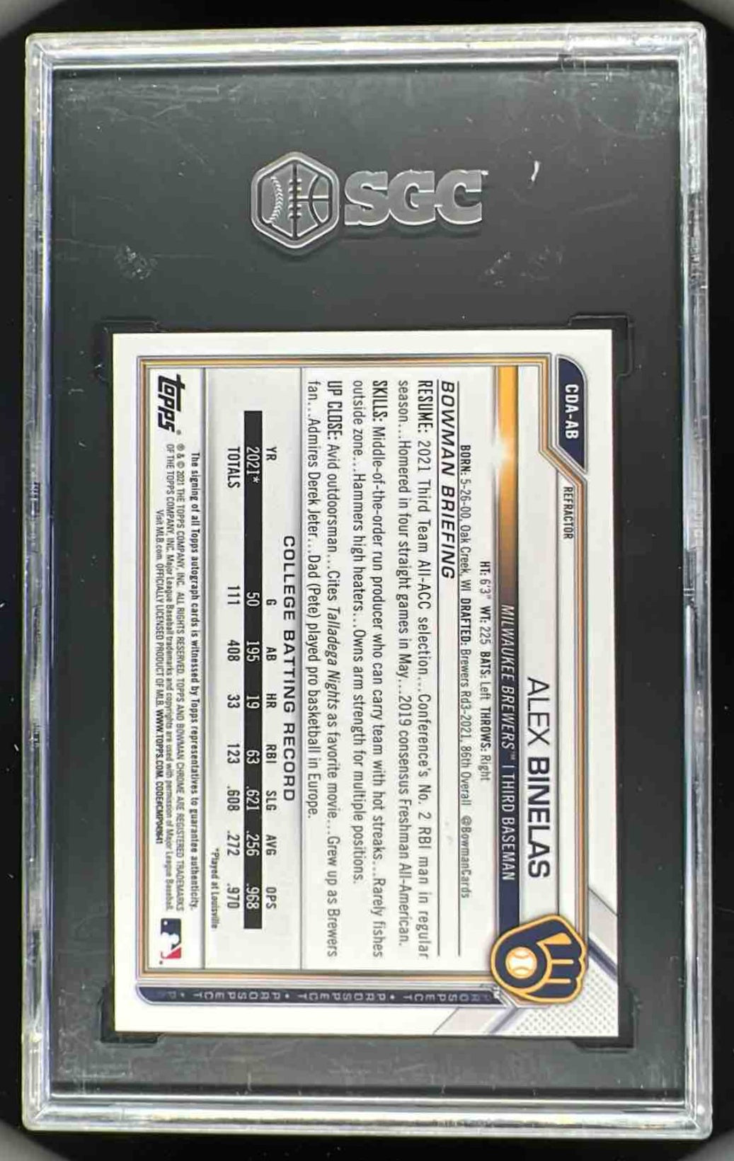 2021 Bowman Draft Chrome Pick Refractor #CDA-AB Alex Binelas Auto /499 SGC 10