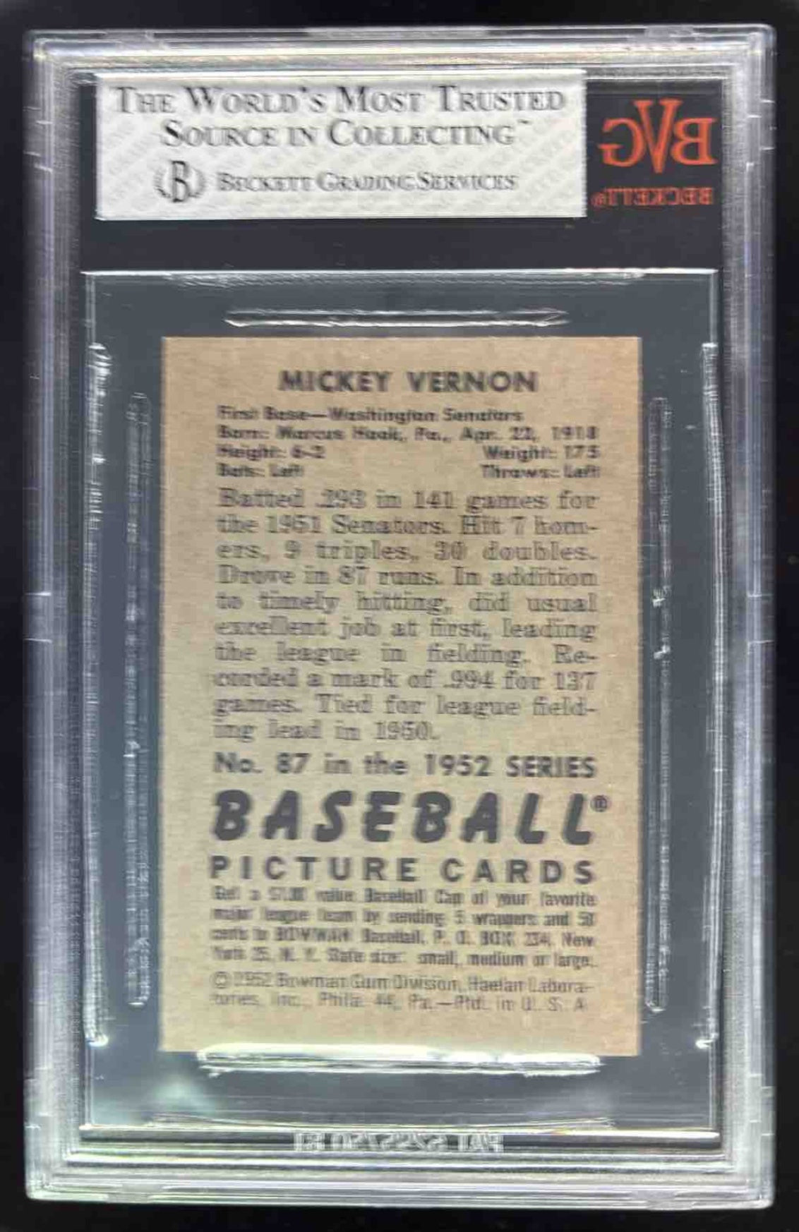 1952 Bowman #87 Mickey Vernon UER BGS 8