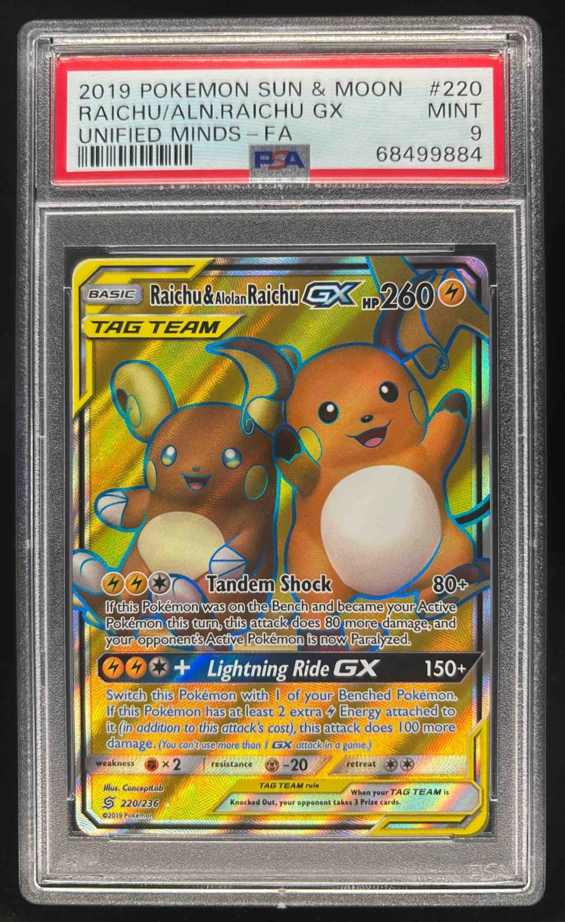 2019 Pokemon Sun & Moon Unified Minds #220 Raichu & Alolan Raichu Tag Team PSA 9