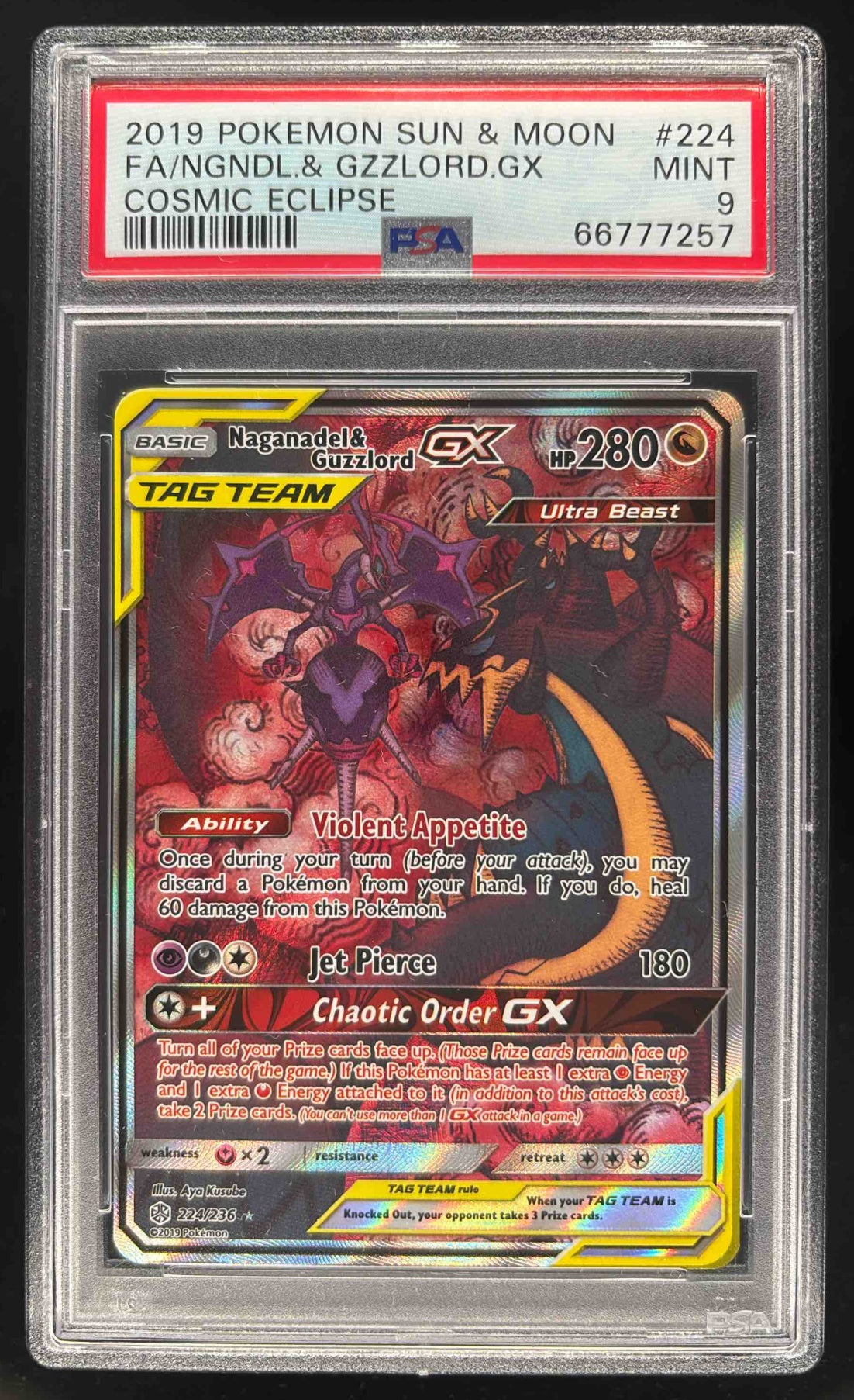2019 Pokemon Sun & Moon Cosmic Eclipse #224 Naganadel & Guzzlord Tag Team PSA 9