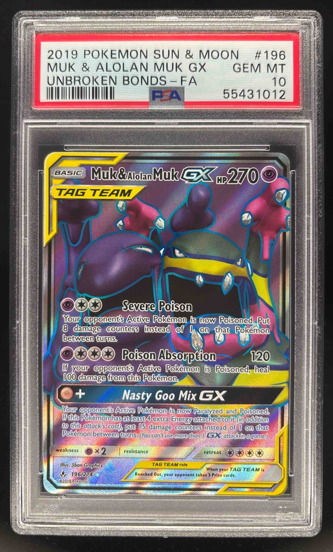 2019 Pokemon Sun & Moon Unbroken Bonds #196/214 Muk & Alolan Muk Tag Team PSA 10