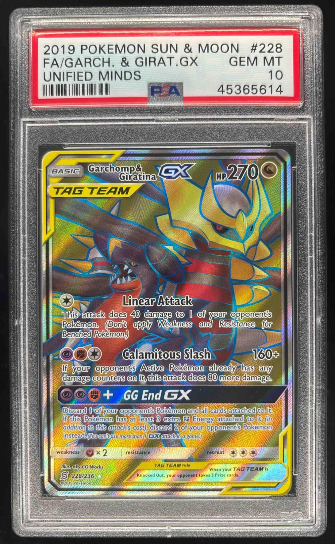 2019 Pokemon SM Unified Minds #228 Garchomp & Giratina Full Art Tag Team PSA 10