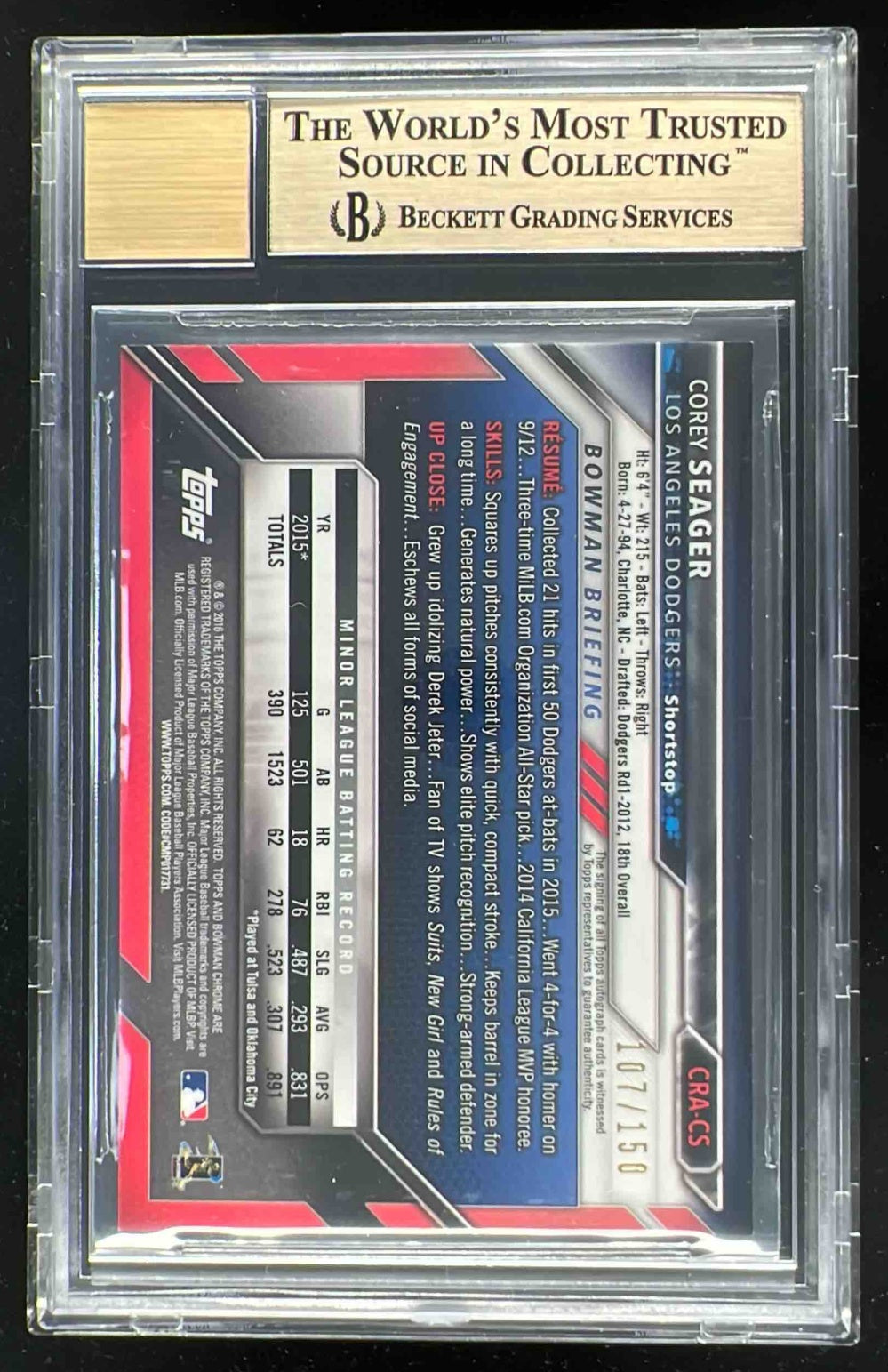 2016 Bowman Chrome Rookie Blue Refractor Corey Seager RC Auto /150 BGS 9.5