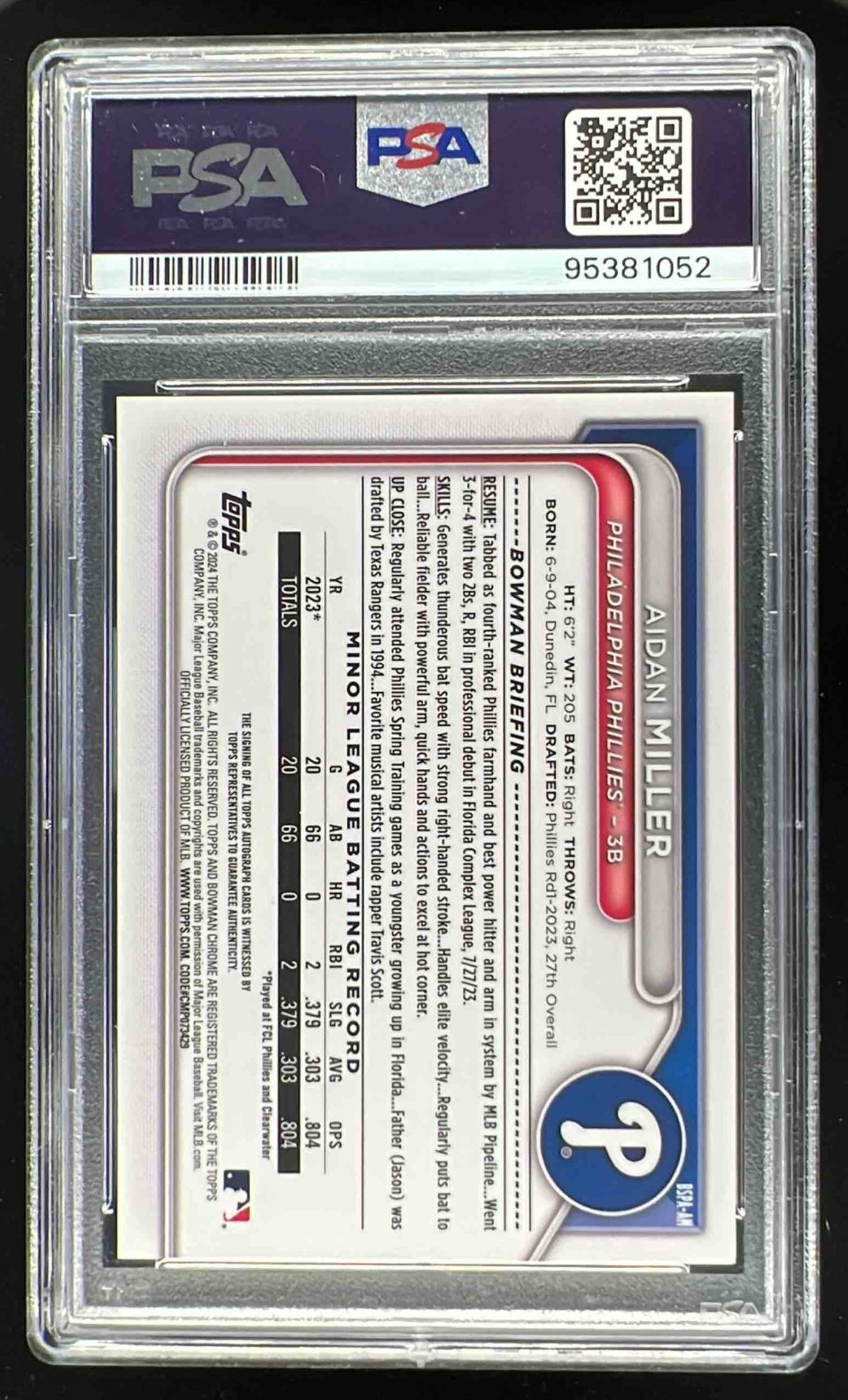 2024 Bowman Sapphire Chrome #BSPA-AM Aidan Miller RC Auto PSA Authentic