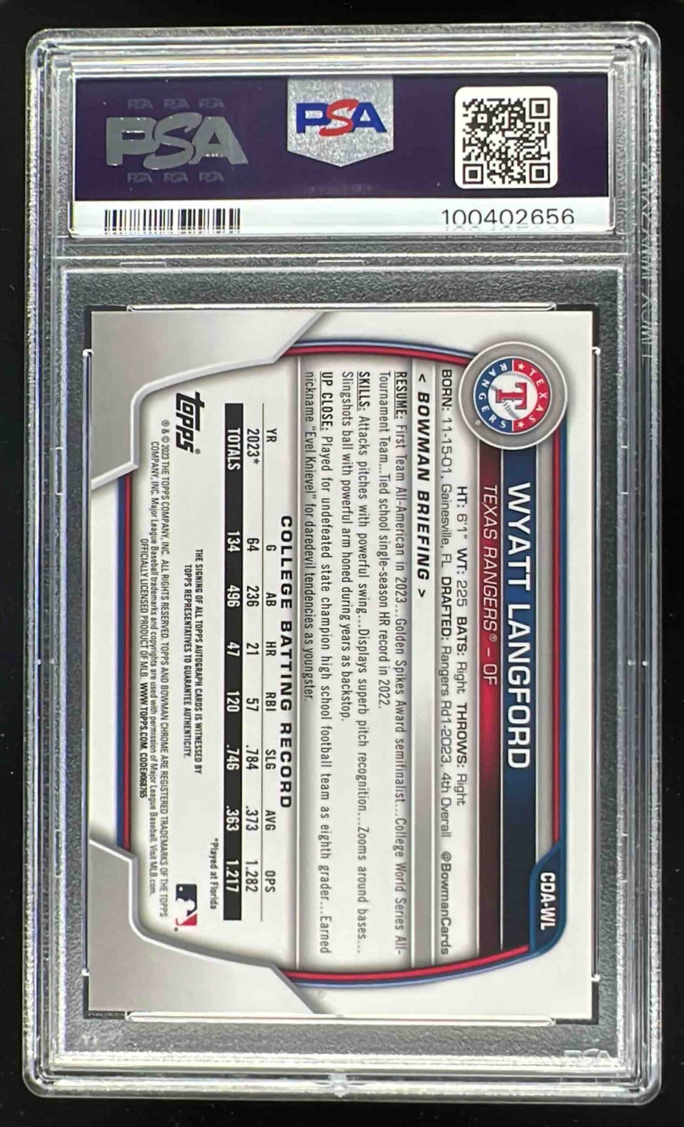 2023 Bowman Draft Chrome Autographs #CDA-WL Wyatt Langford RC Auto PSA 10