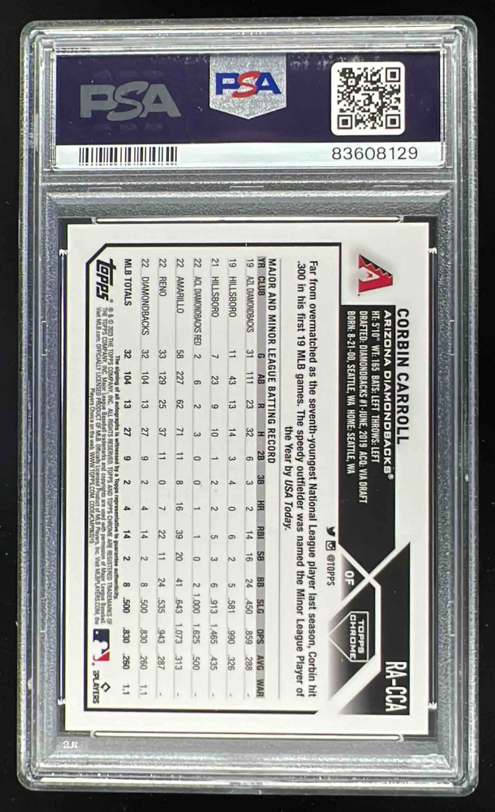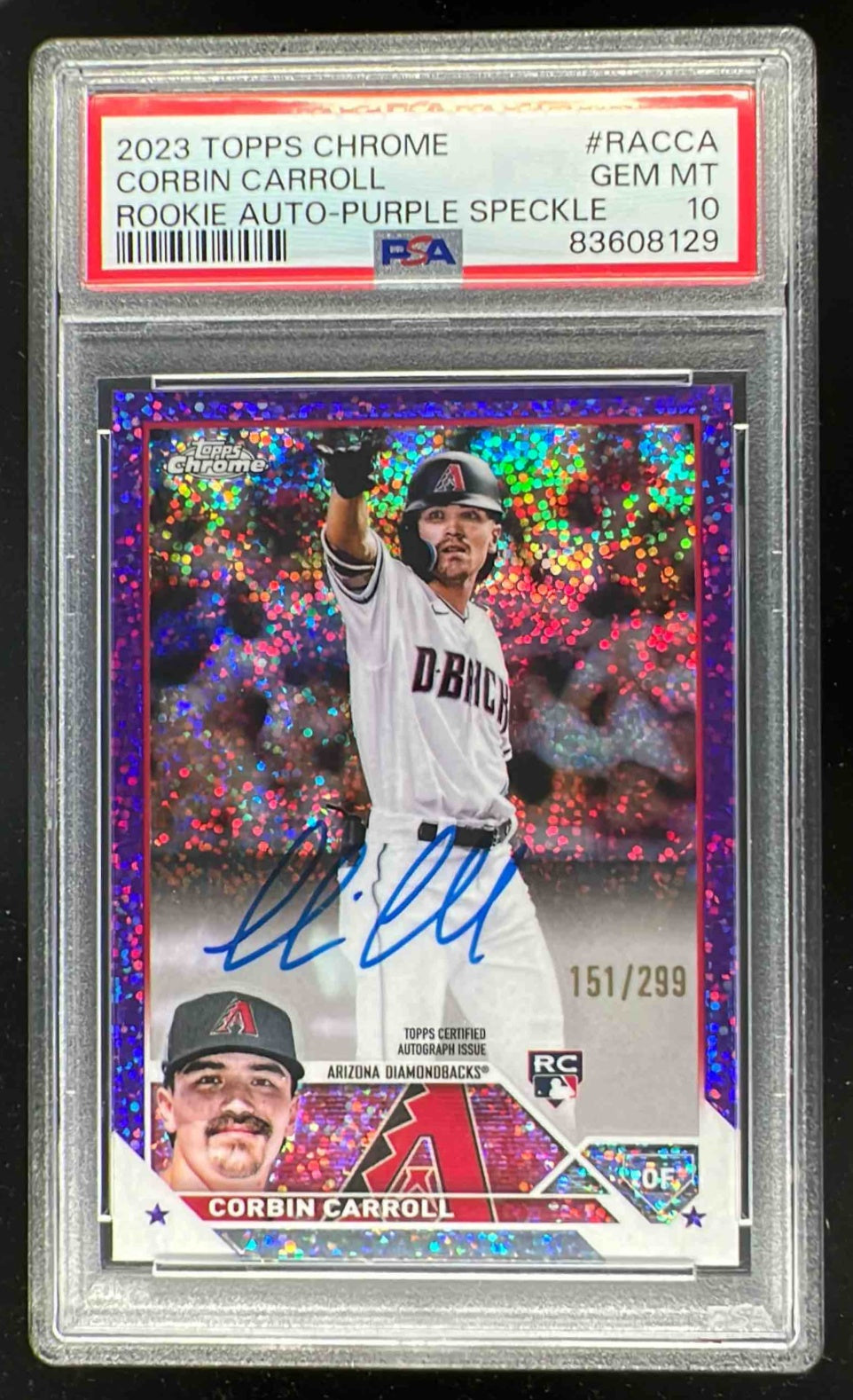 2023 Topps Chrome Rookie Purple Speckle Corbin Carroll RC Auto /299 PSA 10