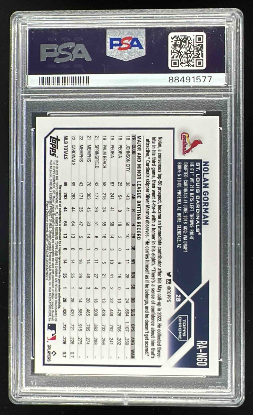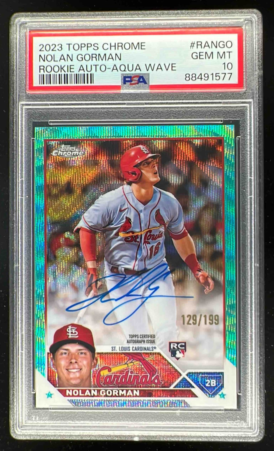 2023 Topps Chrome Rookie Aqua Wave Refractor Nolan Gorman RC Auto /199 PSA 10