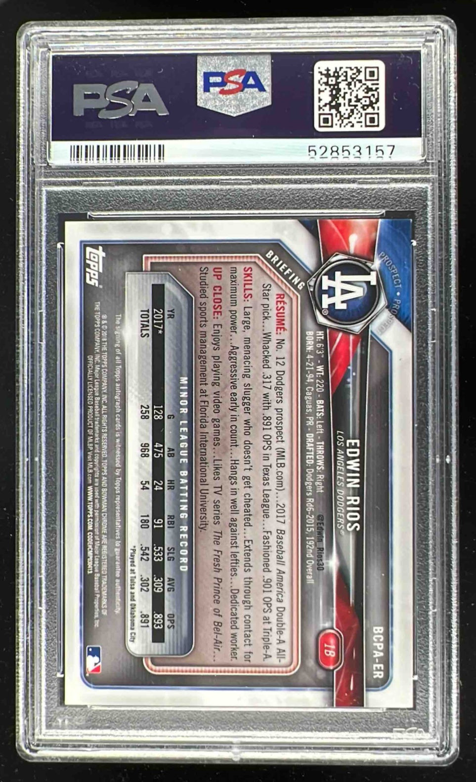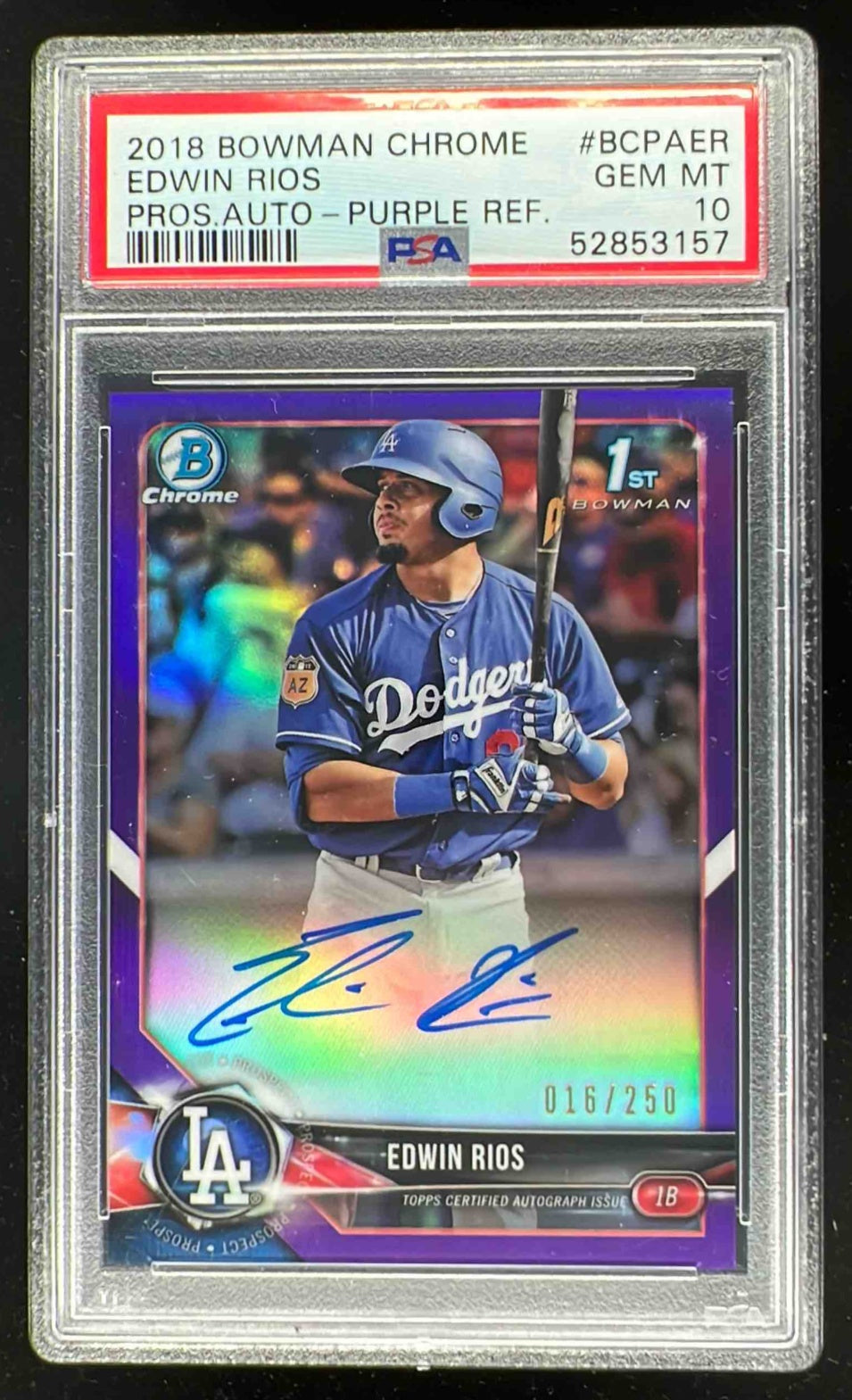 2018 Bowman Chrome Prospects Autographs Purple #ER Edwin Rios Auto /250 PSA 10