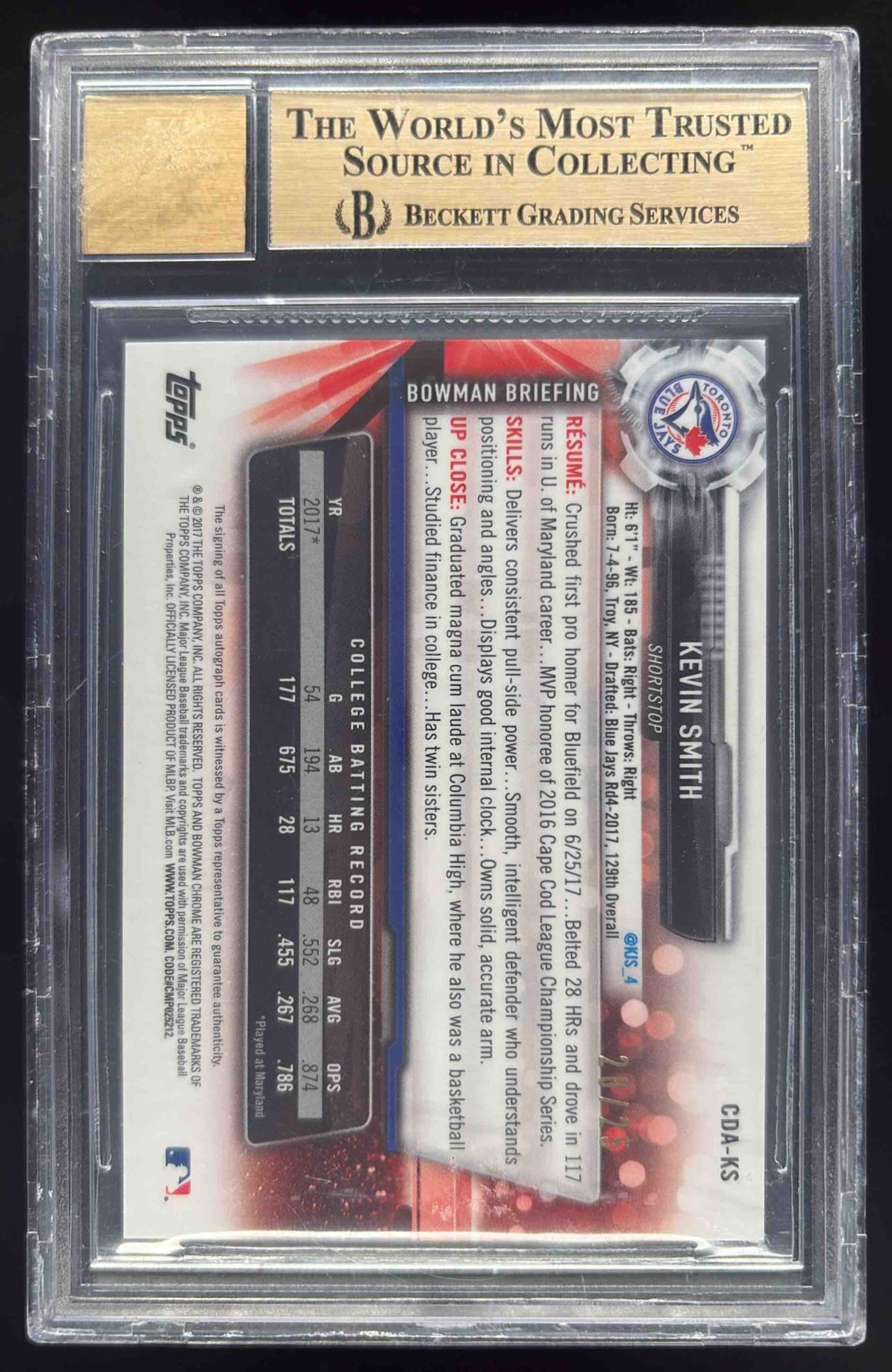 2017 Bowman Draft Chrome Pick Orange Refractor Kevin Smith Auto /25 BGS 9.5