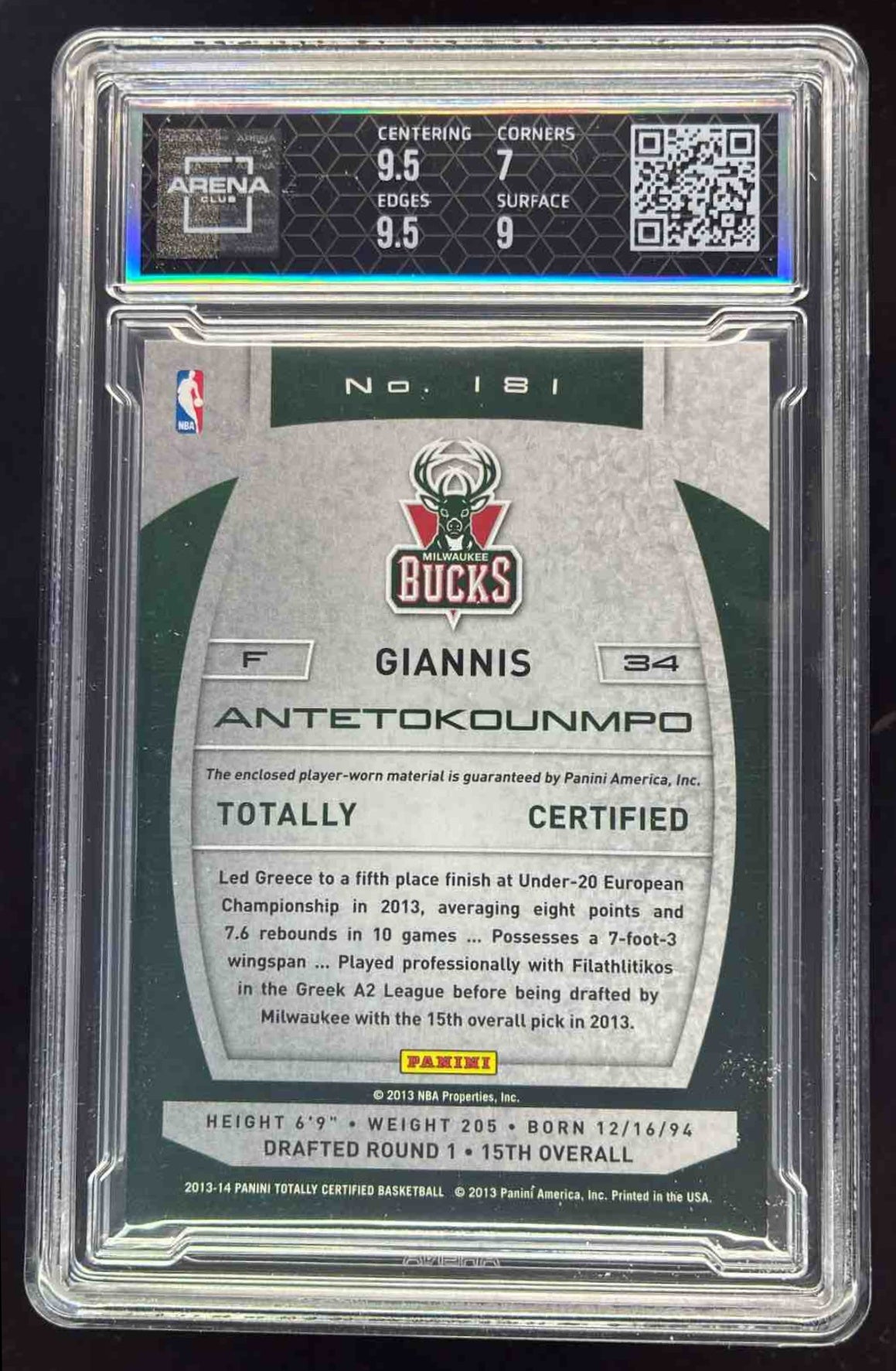 2013 Panini Totally Certified Materials #181 Giannis Antetokounmpo RC Arena 7.5