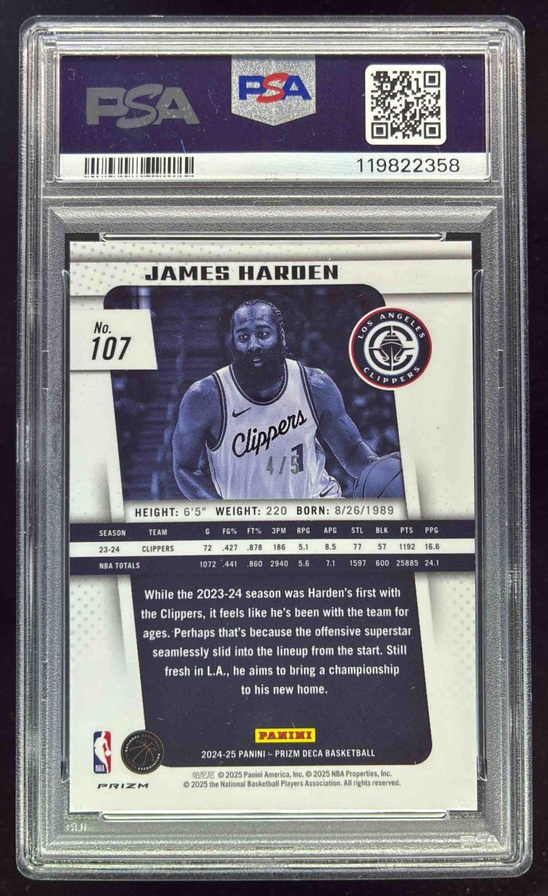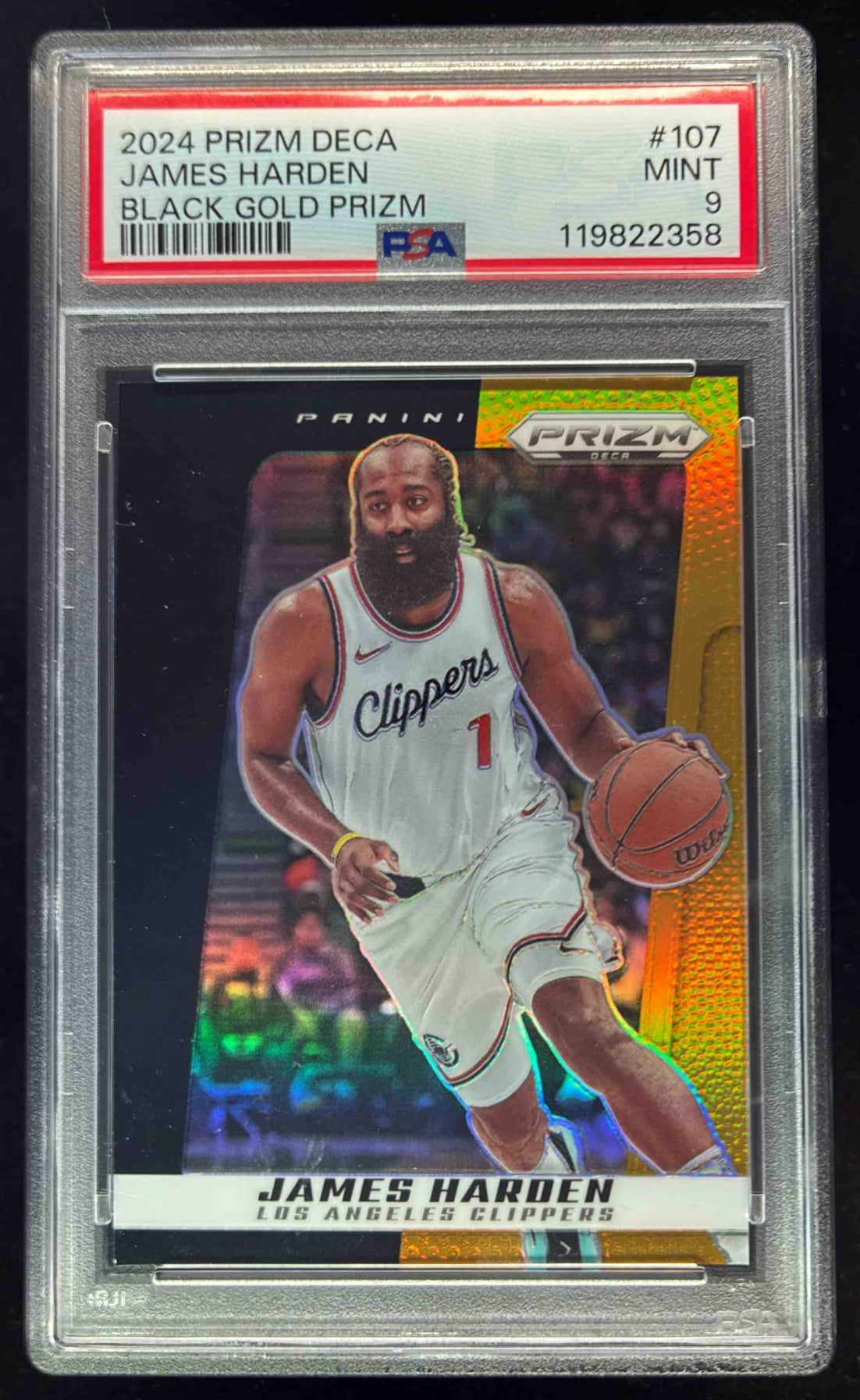 2024-25 Panini Prizm Deca Black Gold Prizms #107 James Harden /5 PSA 9