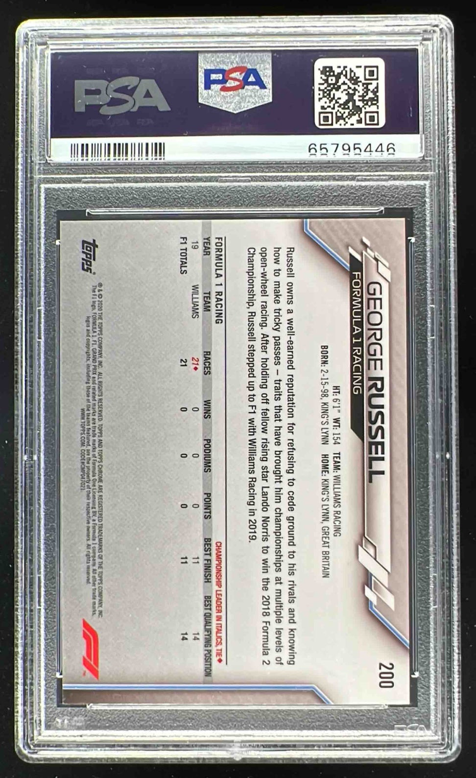 2020 Topps Chrome Sapphire Formula 1 #200 George Russell RC PSA 8