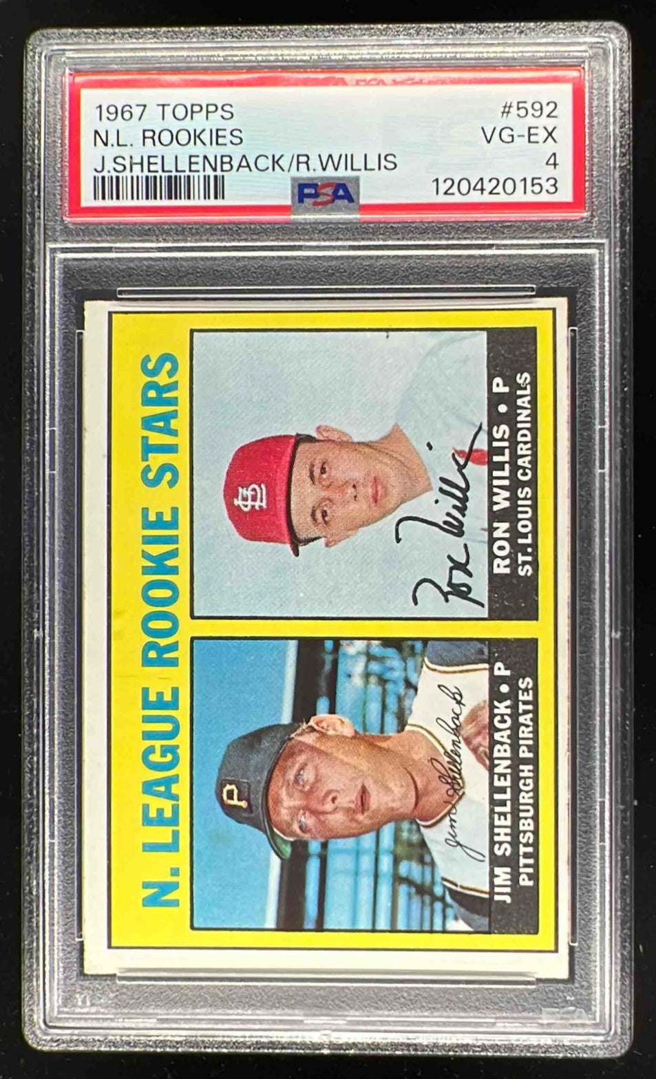 1967 Topps #592 N. League Rookie Stars Jim Shellenback Ron Willis RS, RC PSA 4