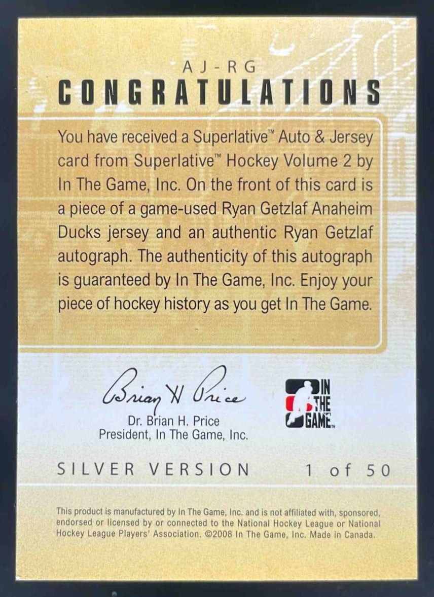 2008 In The Game Superlative Auto Jersey Silver #AJ-RG Ryan Getzlaf /50