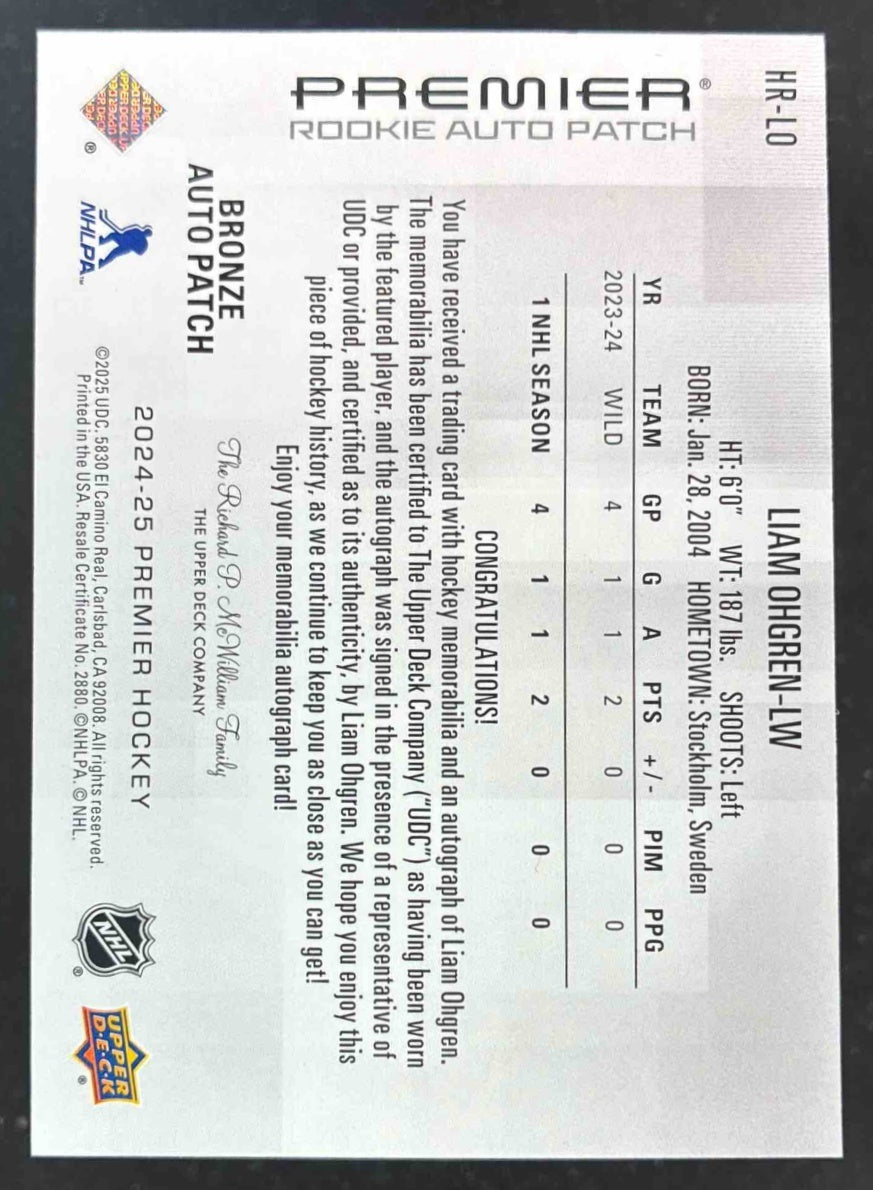 2024 UD Premier Acetate Patch Horizontal #HR-LO Liam Ohgren Autograph Auto /99