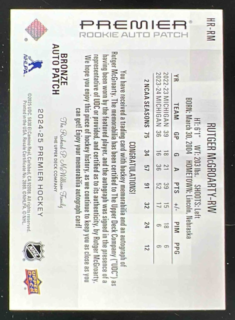 2024 UD Premier Acetate Auto Patch Horizontal #HR-RM Rutger McGroarty Auto /99