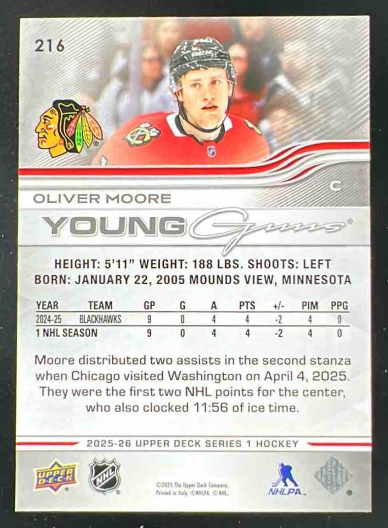2025 Upper Deck Series 1 #216 Oliver Moore Young Guns RC