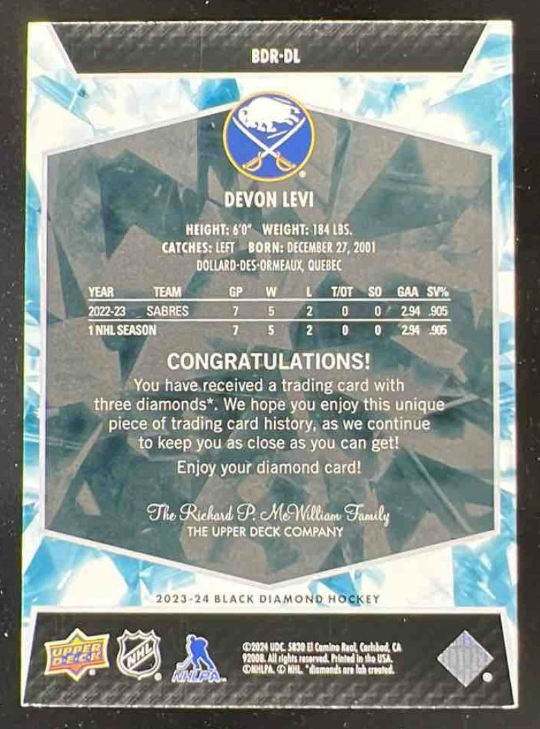 2023-24 Upper Deck Black Diamond Diamond Relic Rookies #BDR-DL Devon Levi RC /99