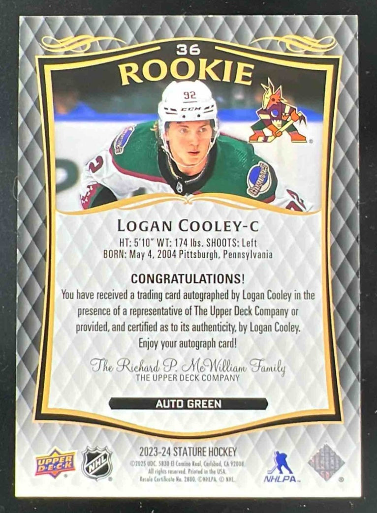 2023-24 Upper Deck Stature Update Auto Green #36 Logan Cooley RC Auto /199