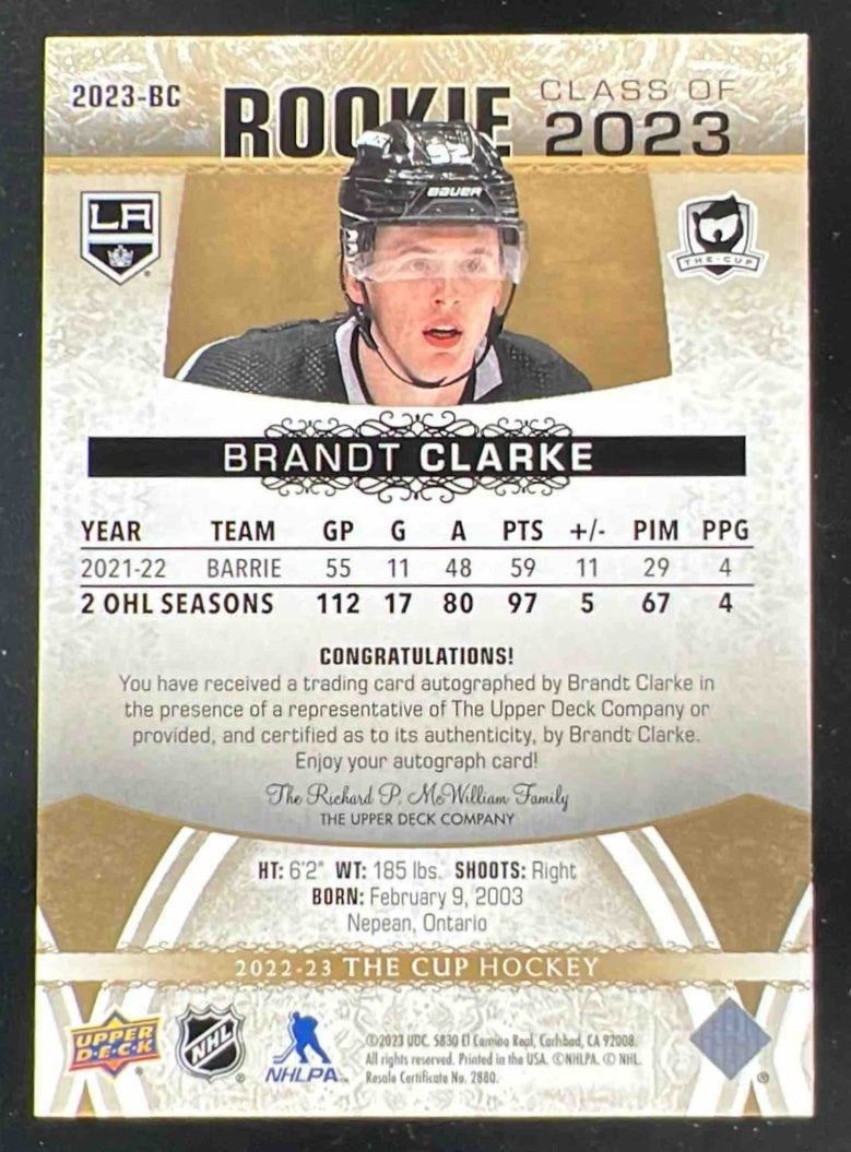 2022 The Cup Rookie Class of 2023 Gold Foil #2023-BC Brandt Clarke RC Auto /50