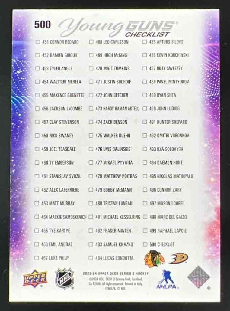 2023 Upper Deck #500 Young Guns Checklist Connor Bedard Leo Carlsson Young Guns