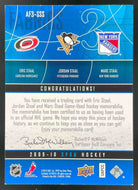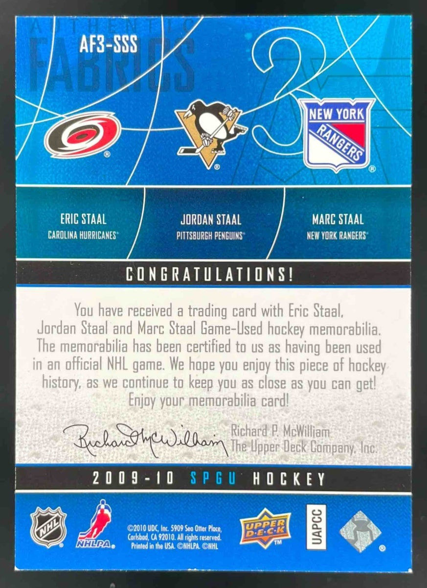 2009 SP Game Used Fabrics Triples Patches Eric Staal Jordan Staal Marc Staal /15