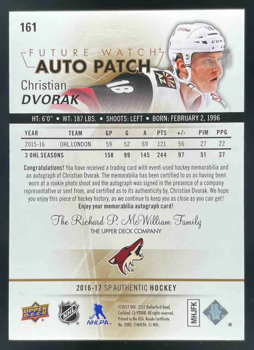 2016 SP Authentic Future Watch Auto Patches #161 Christian Dvorak RC Auto /100