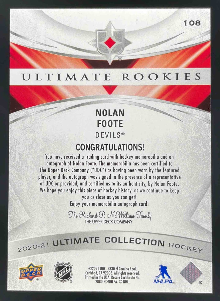 2020 Ultimate Collection Rookie Patch #108 Nolan Foote RC Ultra Rare Auto /99
