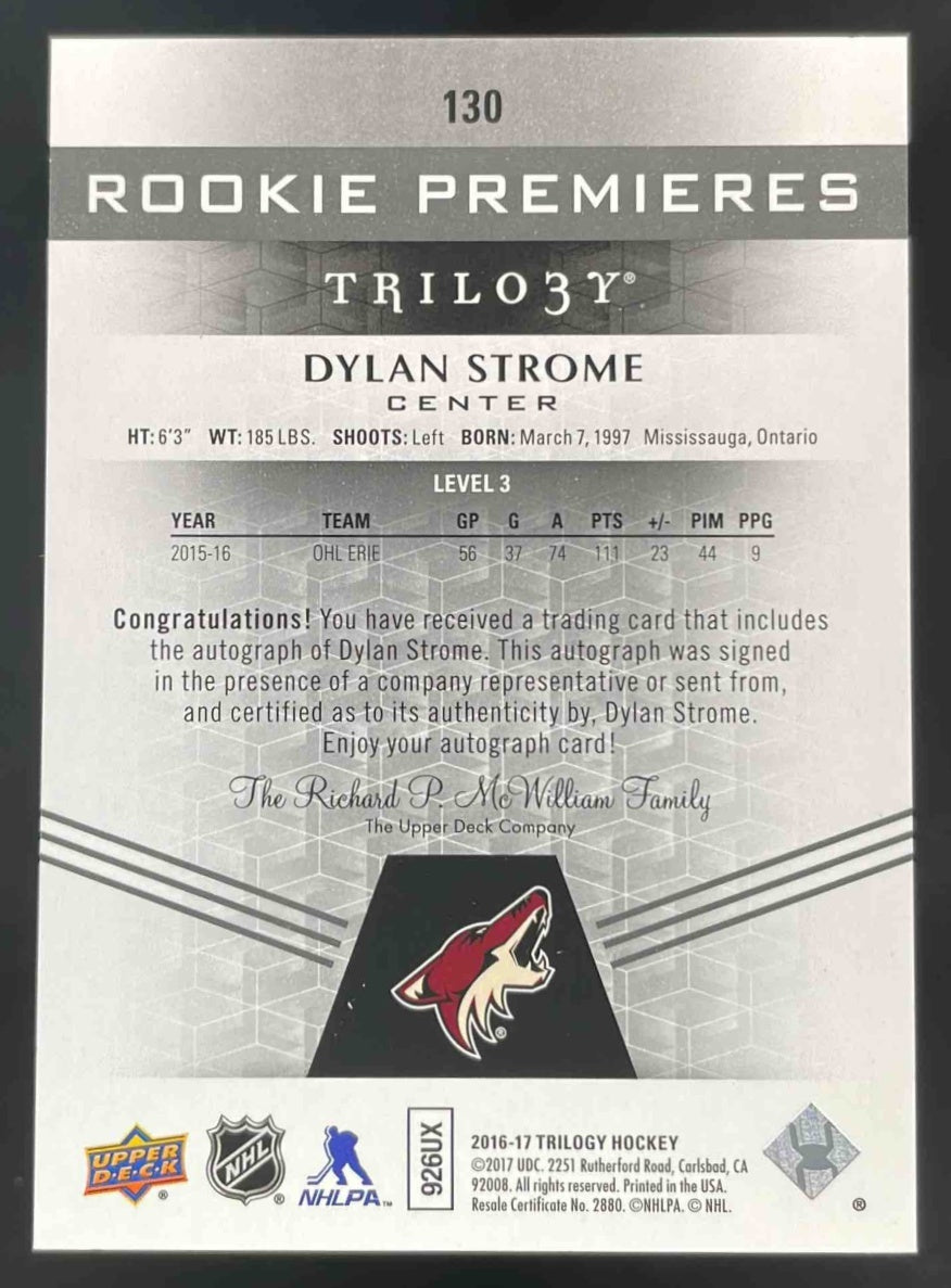 2016-17 Upper Deck Trilogy Black Rainbow Foil Dylan Strome RC Auto /3