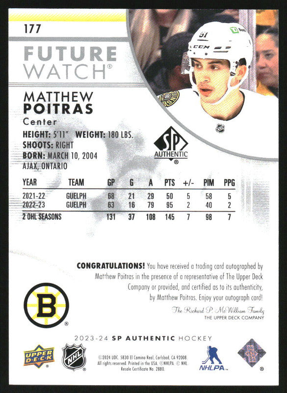 2023-24 SP Authentic #177 Matthew Poitras Rookie Autograph RC Auto /999