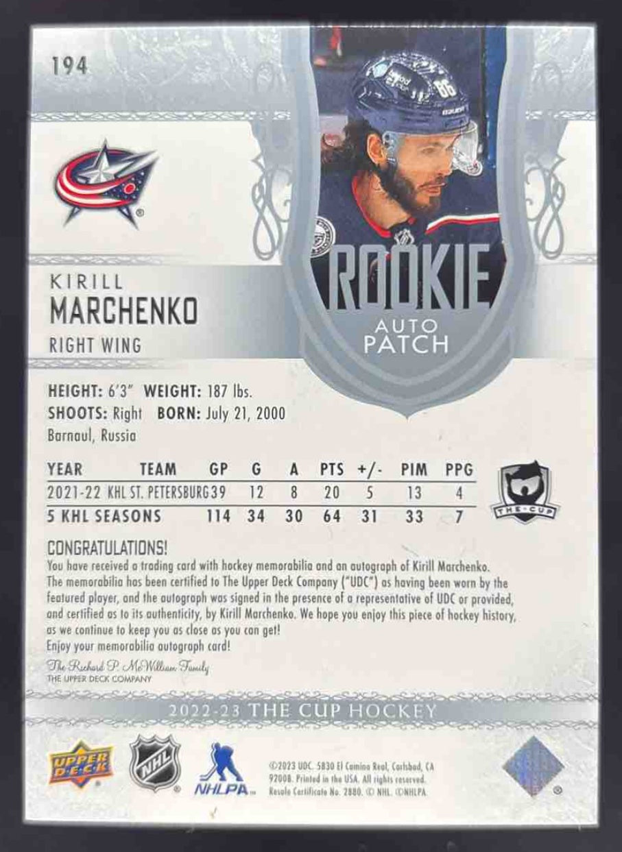 2022-23 Upper Deck The Cup #194 Kirill Marchenko Rookie Patch Auto RC Auto /249