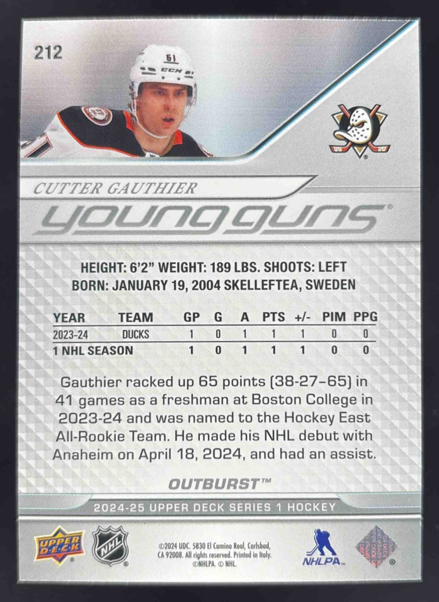 2024-25 Upper Deck Outburst Silver #212 Cutter Gauthier Young Guns RC