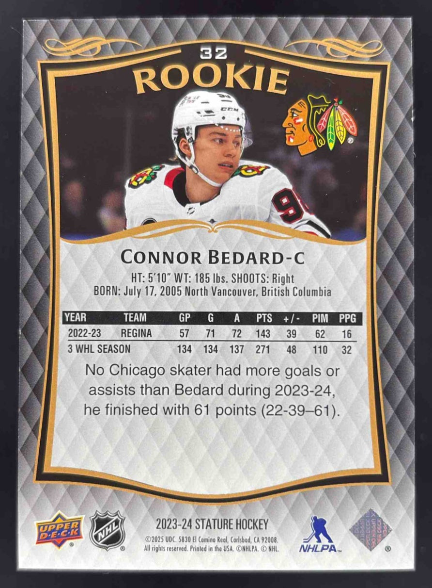 2024-25 Upper Deck Stature 2023-24 Rookies Update #32 Connor Bedard /999