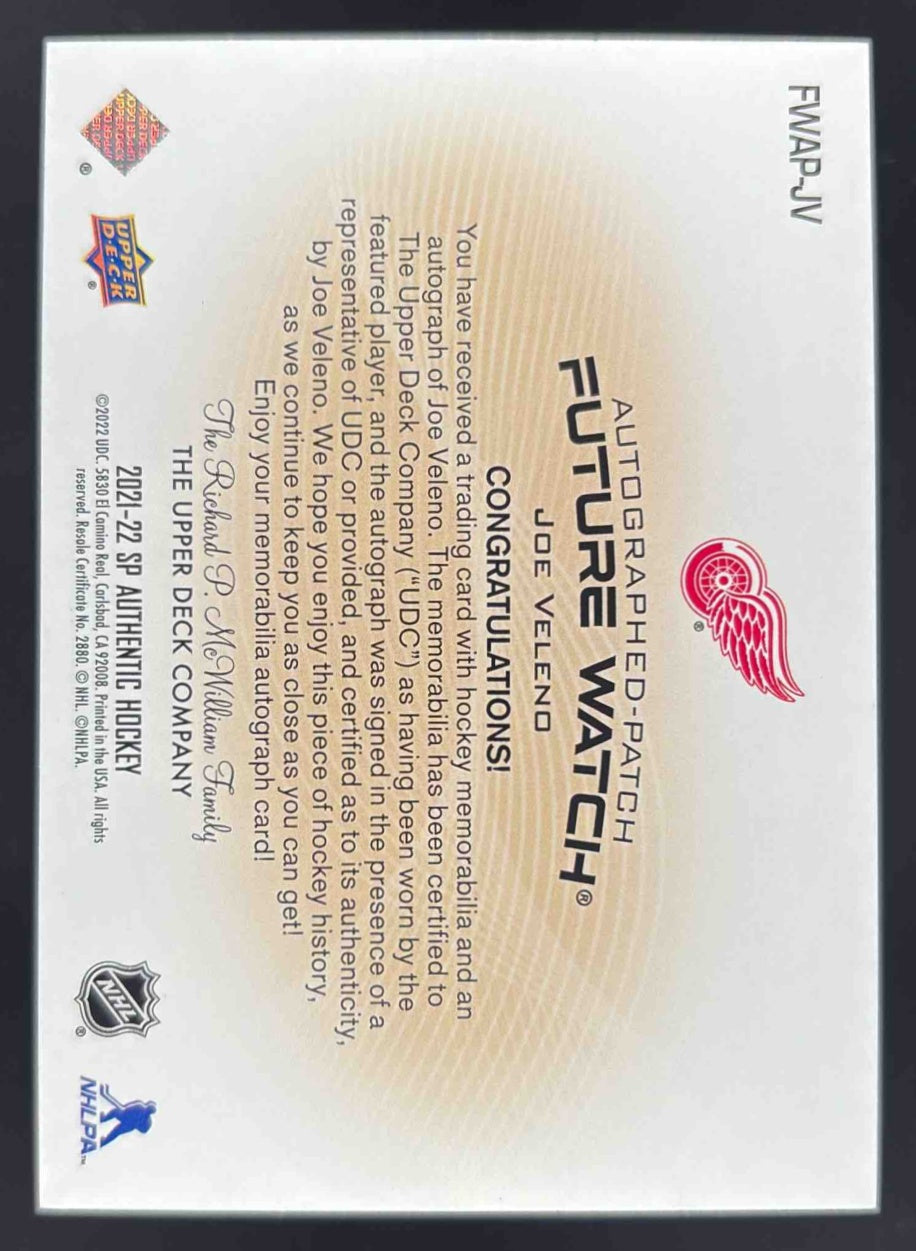 2021-22 SP Authentic Future Watch Patch #FWAP-JV Joe Veleno RC Auto /100
