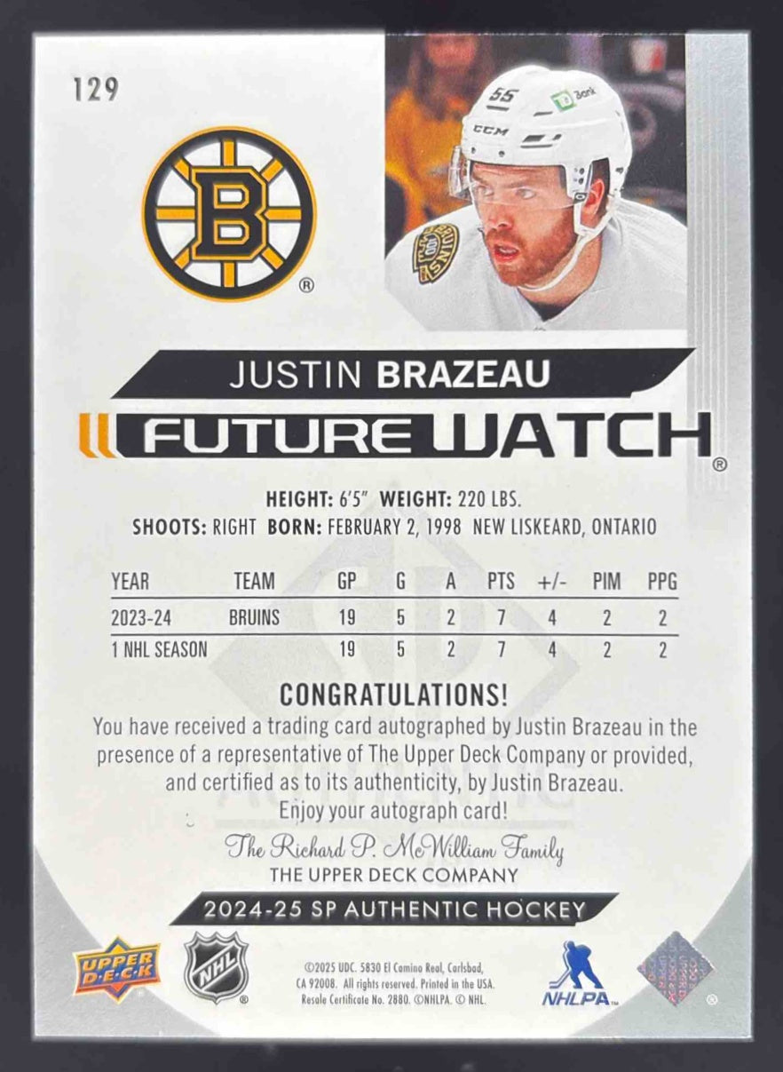 2024-25 Upper Deck SP Authentic #129 Justin Brazeau RC Future Watch Auto /999
