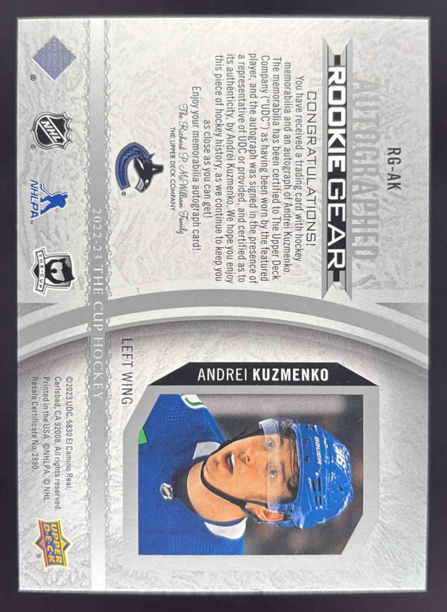 2023 Upper Deck The Cup Autographed Rookie Gear #RG-AK Andrei Kuzmenko Auto /24