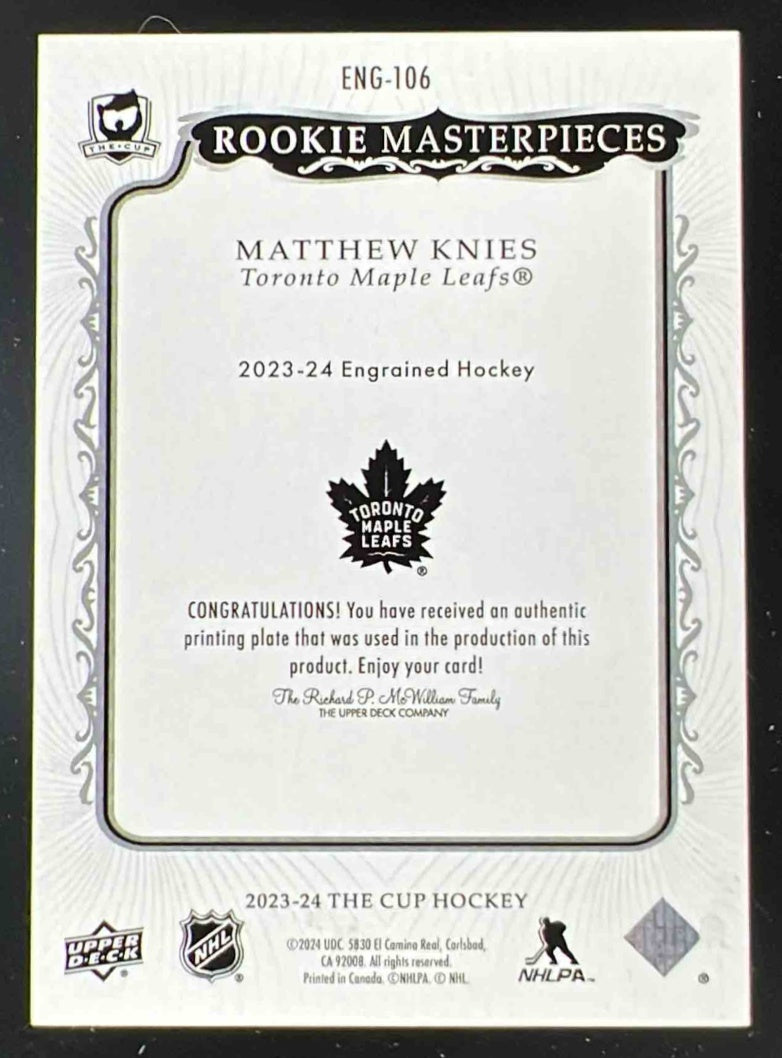 2023 The Cup Rookie Masterpiece Printing Plates Engrained Cyan Matthew Knies 1/1