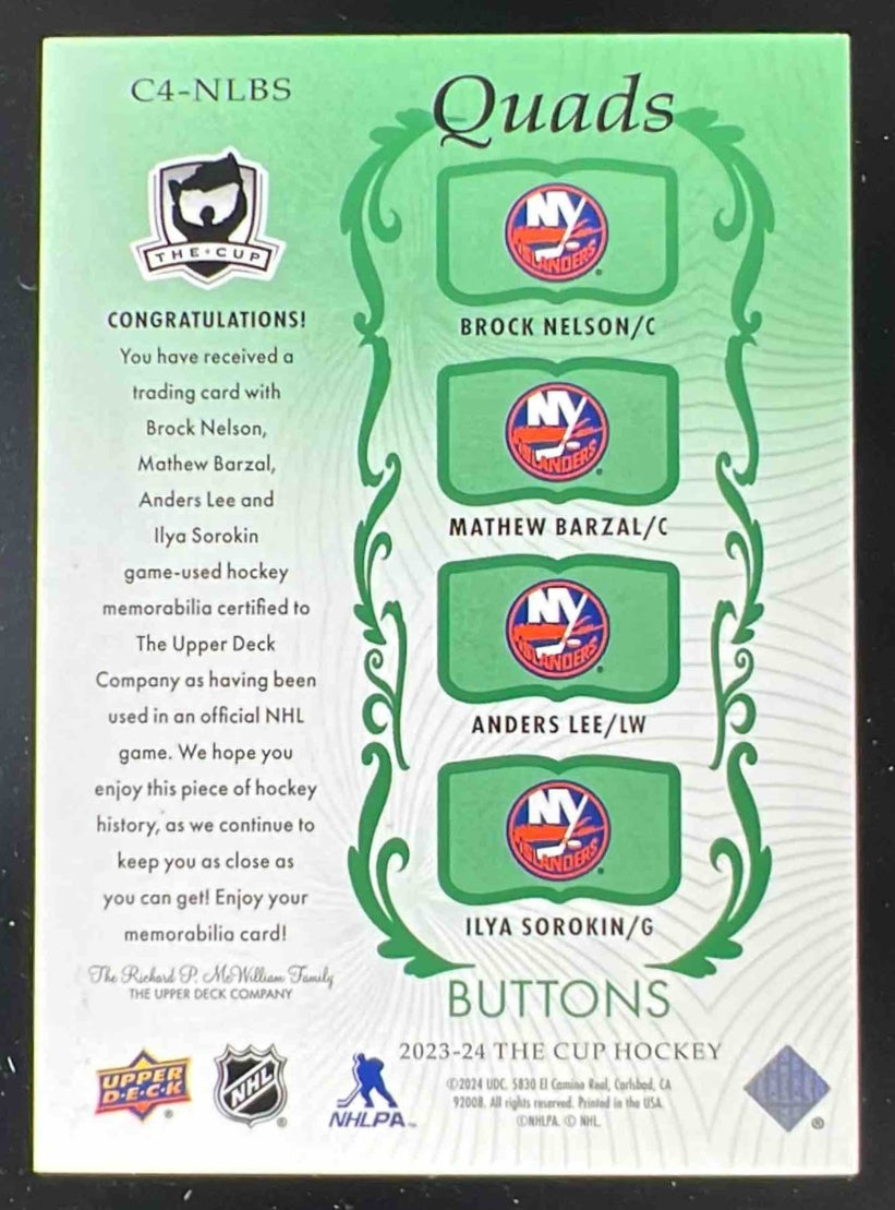 2023-24 The Cup Quads Button Brock Nelson Mathew Anders Lee Ilya Sorokin 1/1