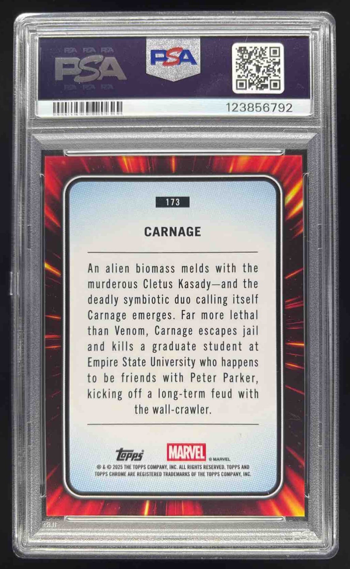 2025 Topps Chrome Marvel Iron Man Red & Gold Lazer Refractor Carnage /100 PSA 8