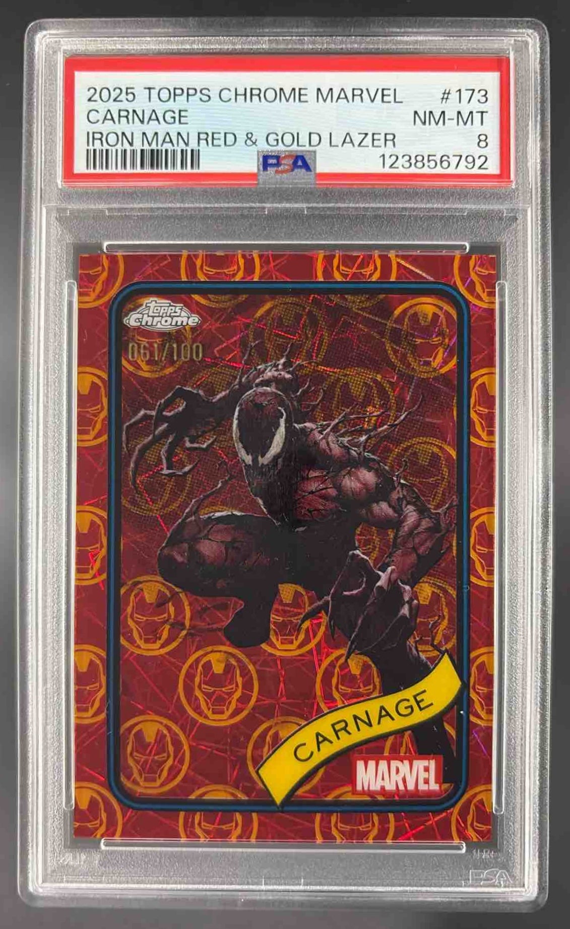 2025 Topps Chrome Marvel Iron Man Red & Gold Lazer Refractor Carnage /100 PSA 8