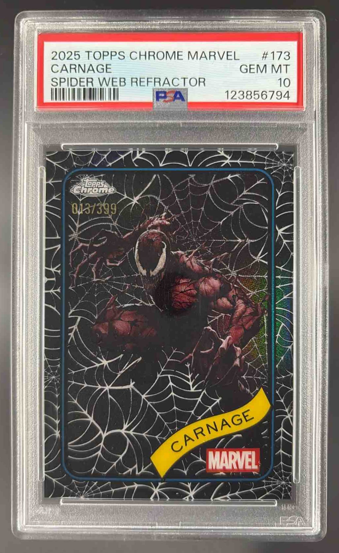 2025 Topps Chrome Marvel Spider Web Refractor #173 Carnage /399 PSA 10