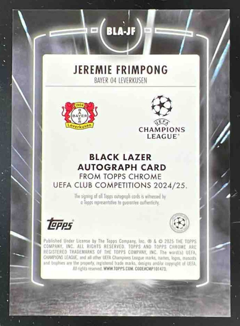 2024-25 Topps Chrome UEFA Black Lazer Autographs #BLA-JF Jeremie Frimpong Auto