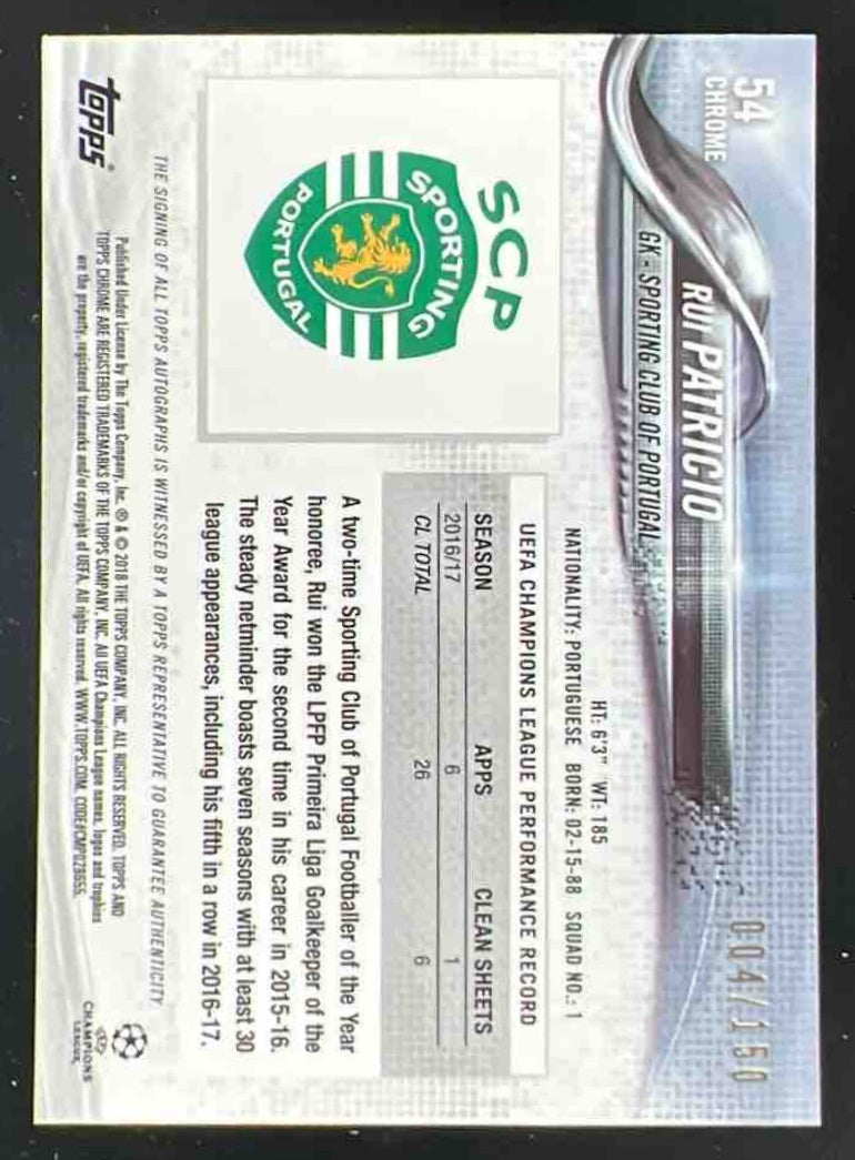 2017 Topps Chrome UEFA Champions Blue Refractor #54 Rui Patricio Auto /150