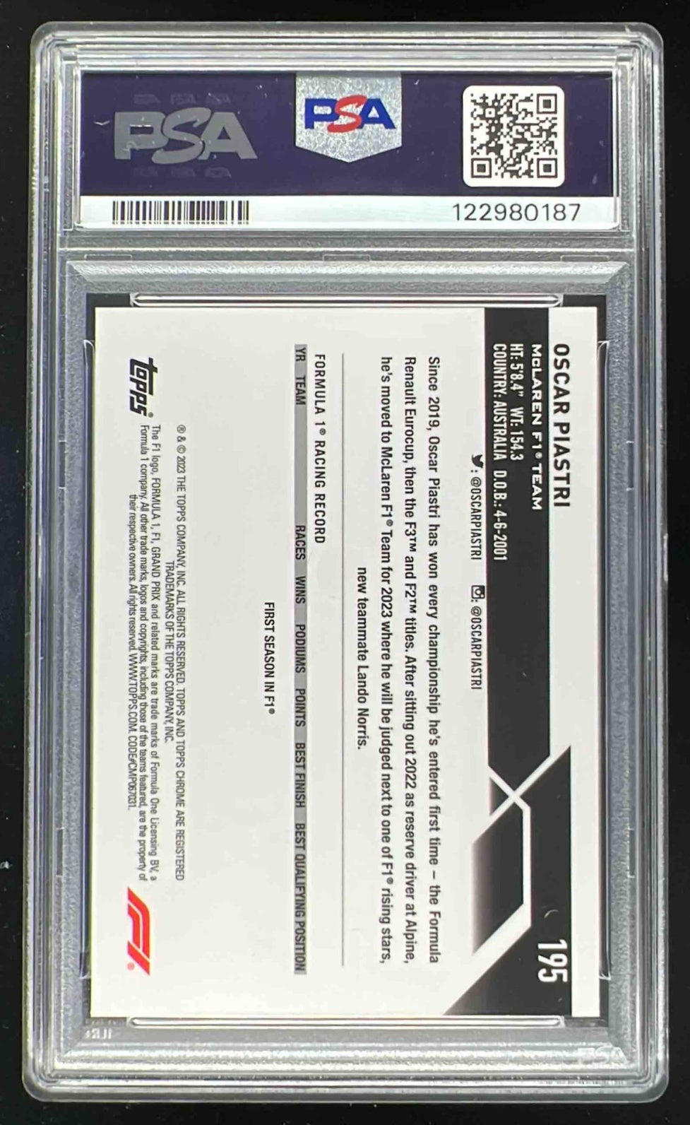 2023 Topps Chrome Formula 1 Purple X Fractor Oscar Piastri RC /199 PSA 10