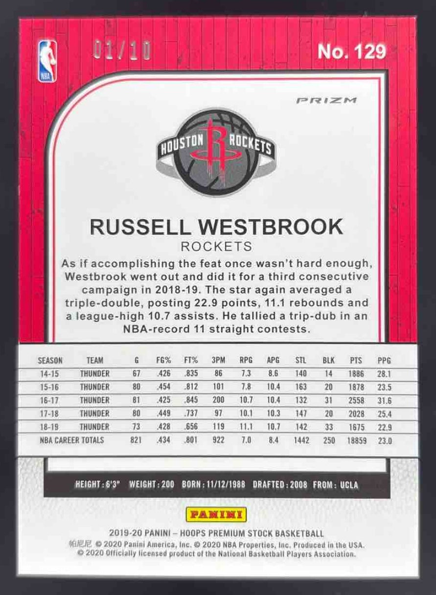 2019-20 Panini Hoops Premium Stock Prizms Gold Mojo #129 Russell Westbrook /10